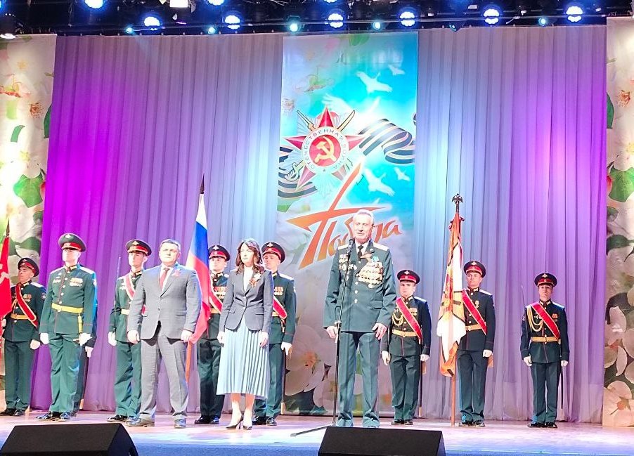 Перед входом во Дворец культуры прошло торжественное мероприятие с участием военнослужащих округа, которые внесли Государственный флаг России, копию знамени Победы и боевое знамя гвардейского Московского-Тартусского окружного учебного центра Минобороны.