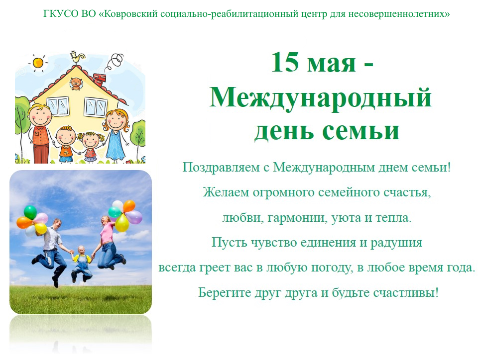 ГКУСО ВО "Ковровский социально-реабилитационный центр для несовершеннолетних" поздравляет всех с Международным Днем семьи!