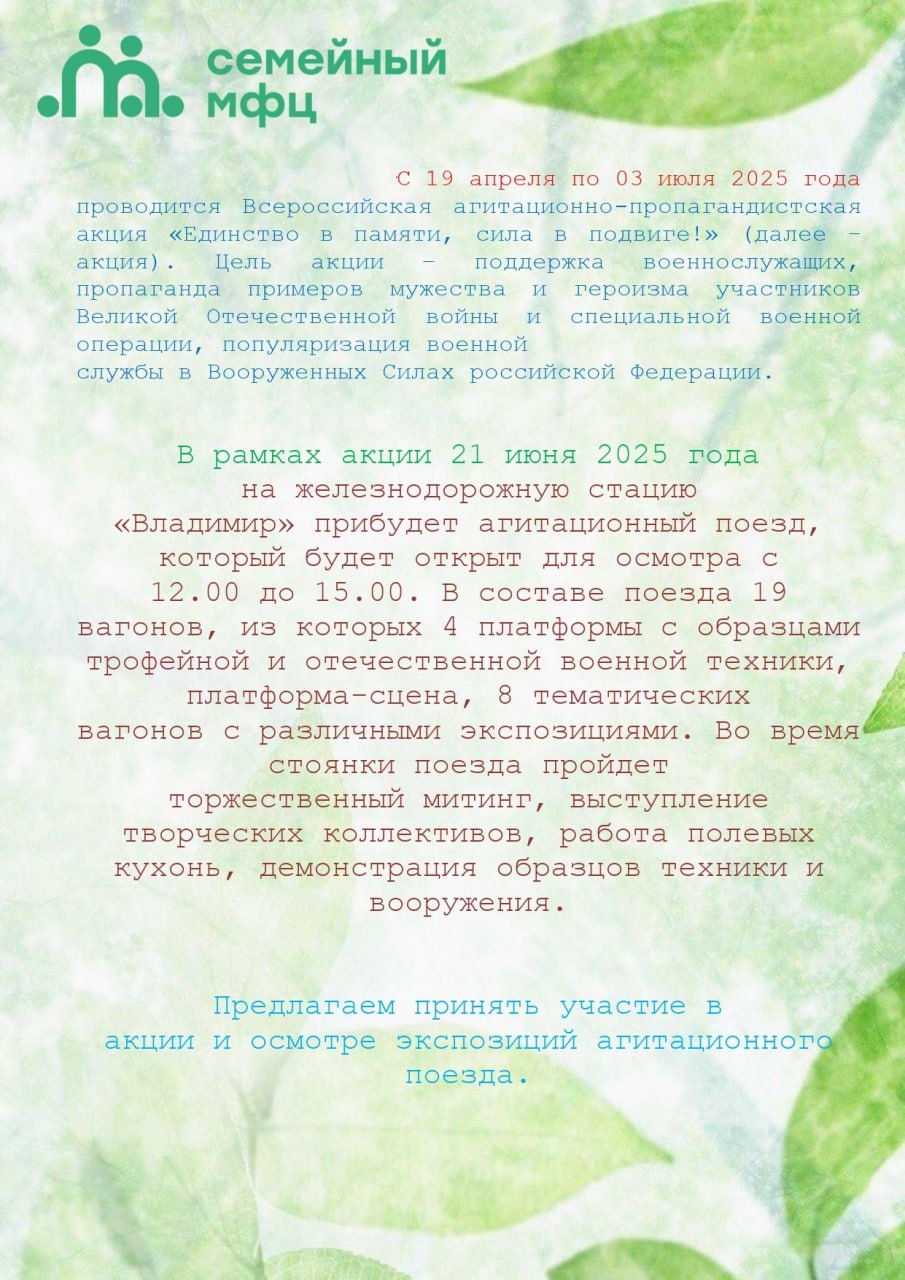 В рамках Всероссийской агитационно-пропагандистской акции "Единство в памяти, сила в подвиге!" 21 июня 2025 года на железнодорожную станцию "Владимир" прибудет агитационный поезд, который будет открыт для осмотра с 12.00 до 15.00.