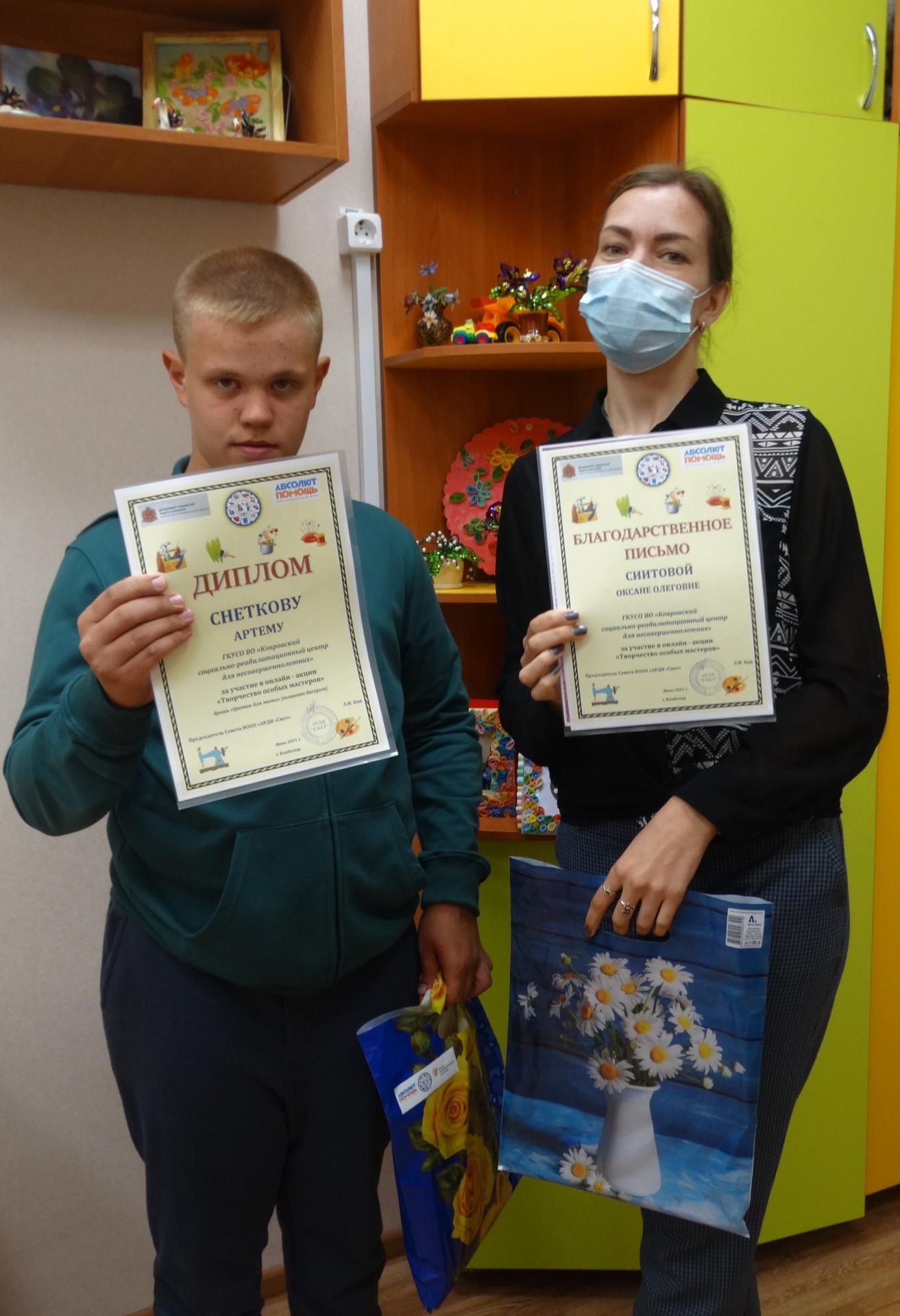 Воспитанник отделения реабилитации детей с ограниченными возможностями и ранней помощи ГКУСО ВО «Ковровский социально-реабилитационный центр для несовершеннолетних» Артем Снетков и специалист по комплексной реабилитации Сиитова Оксана Олеговна приняли участие в фестивале, продемонстрировав выполнение броши «Цветок для мамы» в технике вышивка бисером. Участники были награждены памятными подарками и дипломами.