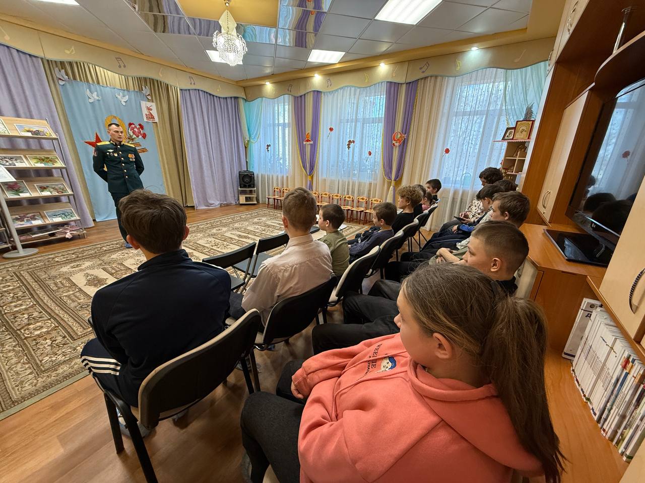 Гостем мероприятия стал гвардии капитан Максимов Андрей Александрович, военнослужащий, участник СВО. Беседу с ребятами он начал с рассказа о себе: о курсантском периоде, о службе в танковых войсках, о готовности защищать интересы Родины в бою.