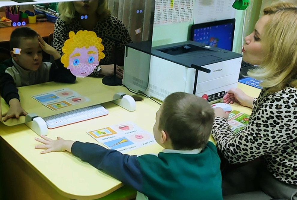 Во время занятия педагог подбирает через компьютер необходимые упражнения, которые отображаются на экране «Умного зеркала». Ребёнок видит одновременно своё отражение и интерактивные материалы. Мульт-персонажи на экране вовлекают малыша в игру, помогая осваивать правильное звукопроизношение и развивать речевые навыки.