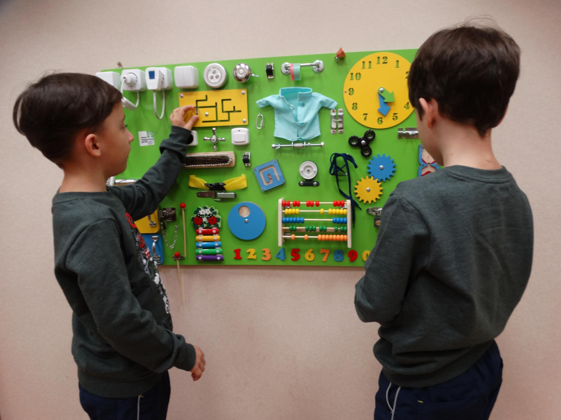 Ребята, посещающие отделение реабилитации, с удовольствием занимаются на бизиборде. Играя, они учатся самостоятельно совершать те или иные действия снова и снова. Всё получается не гладко и не сразу, но это только поддерживает стремление освоить необходимые навыки.